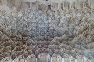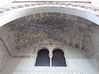 sebka, según disposición frecuente en edificios mamelucos de El Cairo. La portada esta rematada por un gran alero sostenido por canes de madera que protegería con su vuelo las labores, seguramente policromadas, del estuco. A través del zaguán, con bóveda de