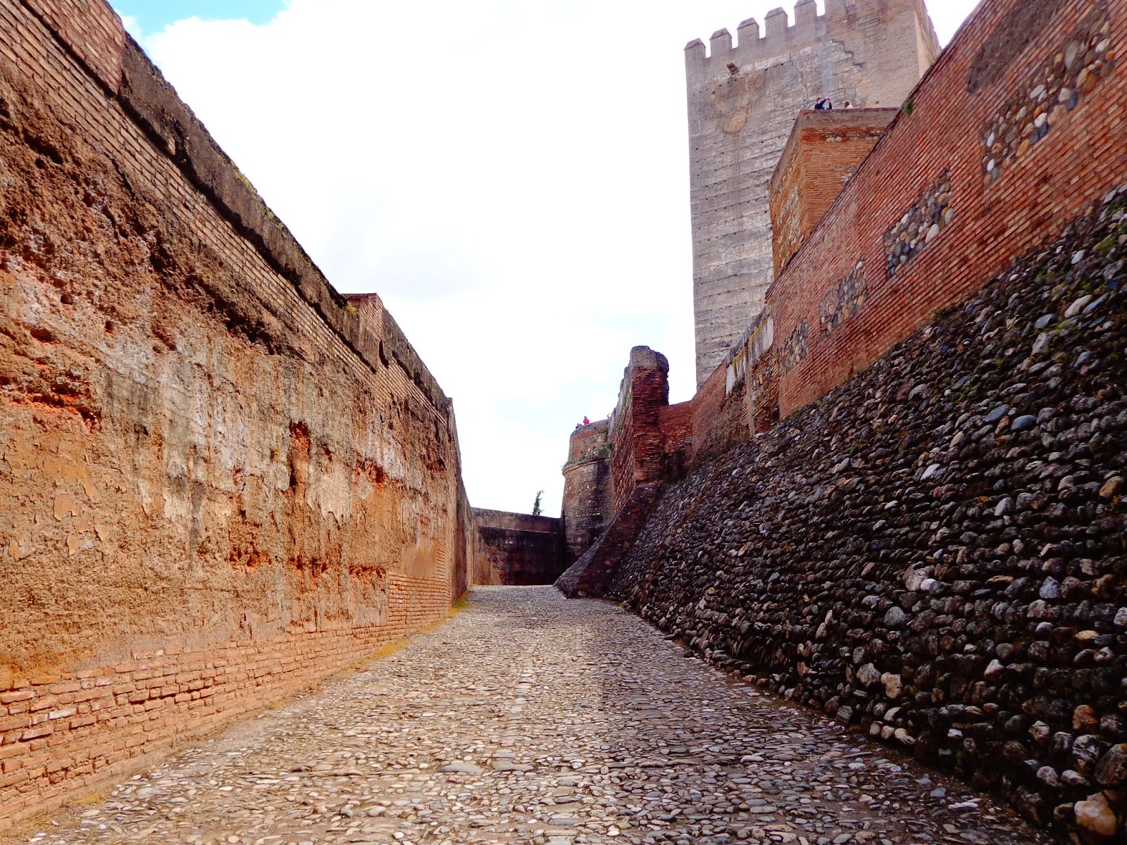 | Camino de Ronda interior con la Torre del Homenaje al fondo y muralla interior más elevada a la derecha |