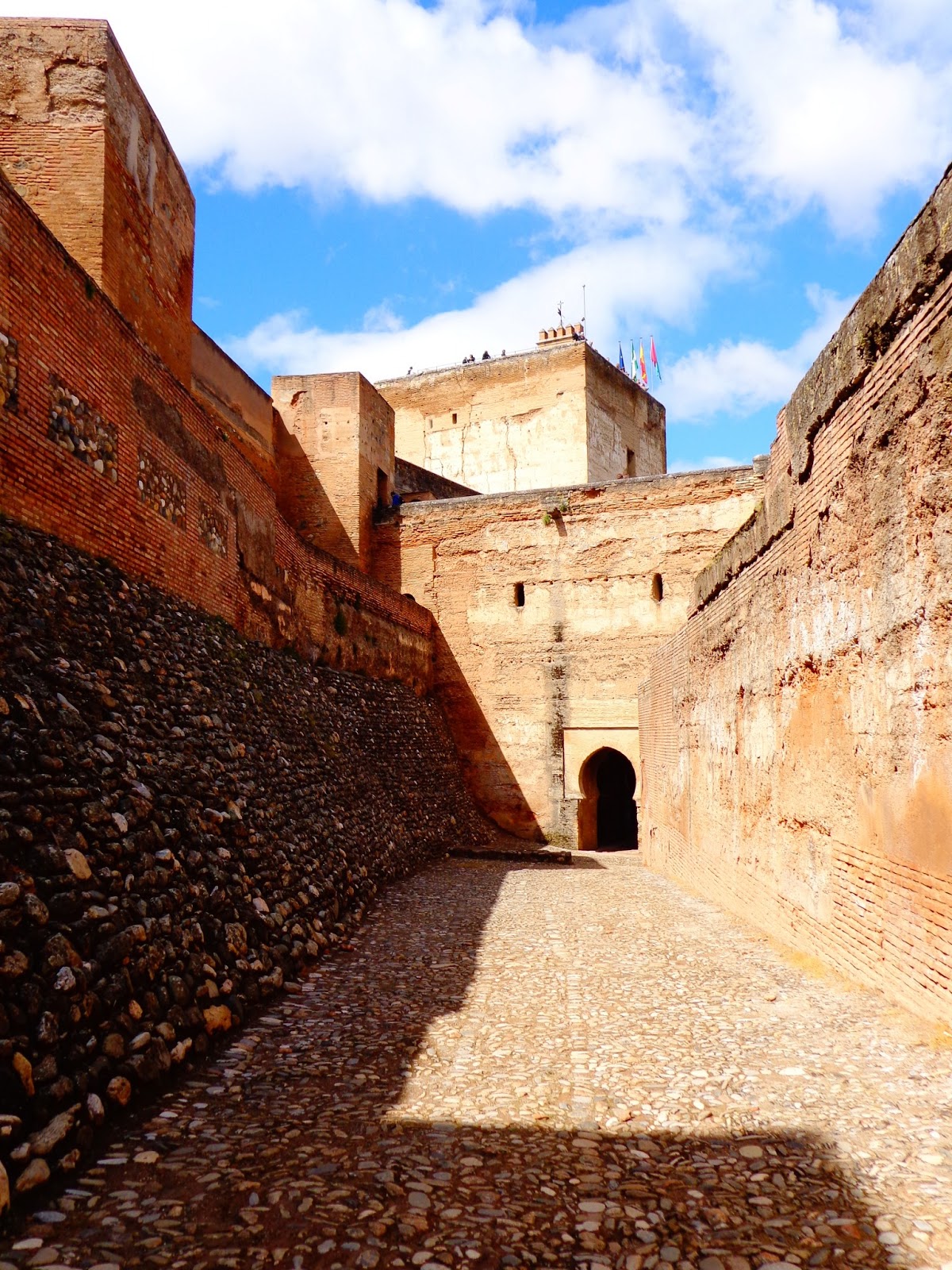 La disposición de torres, murallas de circunvalación y fosos fueron construidos para facilitar la defensa o el ataque desde el interior de la fortaleza, concebidos para que el cuerpo de guardia pudiera hacer su ronda por el adarve alto de la muralla sin tener que descender al adarve bajo (calle paralela al adarve alto), haciéndose subterráneos al pasar por conjuntos palaciegos para evitar obstáculos, permitiendo un control total y la protección sin interferir en la vida civil. Al mismo tiempo se ven las colinas en frente, la ancha llanura de la vega y las lejanas montañas con sus torres vigía en el horizonte. Y sin embargo, uno se encuentra separado de todo, como en un mundo aparte, en un alcázar de perlas.