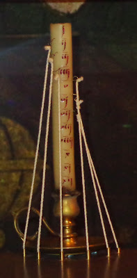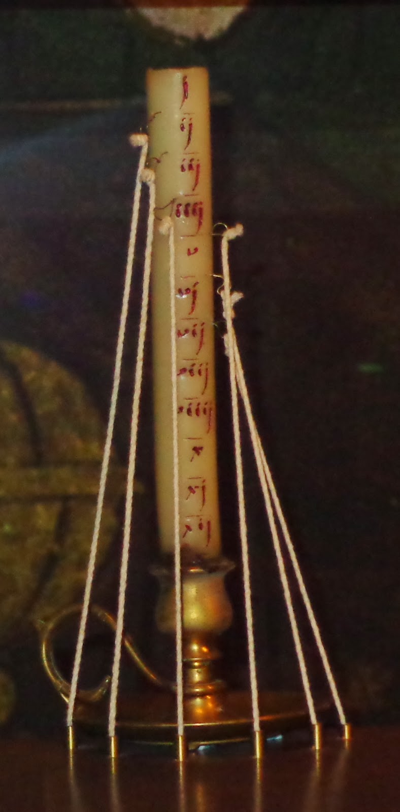 | Cirio o vela colocado sobre el horologio con las horas marcadas y de las que cuelgas unos hilos de lino que accionan el mecanismo. |
