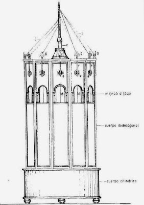 Ibn al-Jatib describe el artefacto en su obra Nufada III (de la cual se conservan dos ejemplares, uno en Casablanca y otro incompleto en la Universidad de Leiden, en los Países Bajos), un horologio para contar las horas de estructura hueca en madera, ligero para su fácil traslado, de forma triangular con doce lados y una altura de 1,70 metros aproximadamente, en cuya cúspide se colocaba un cirio que tiene marcado las horas nocturnas.