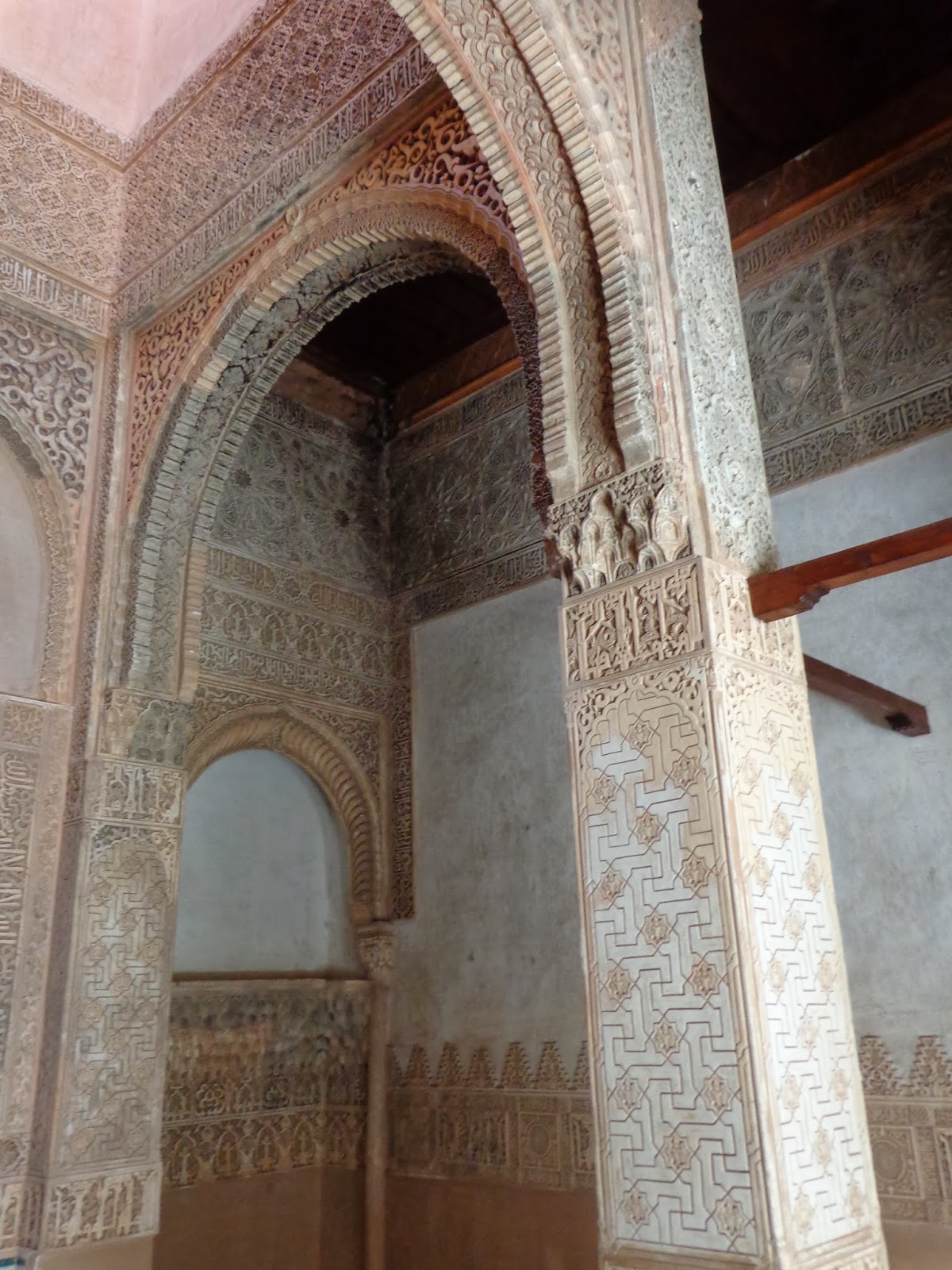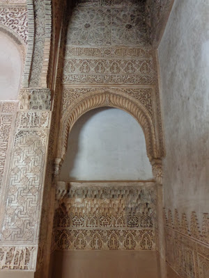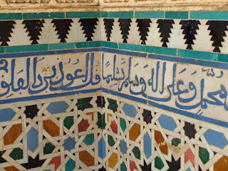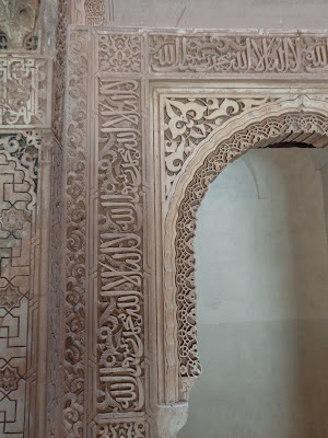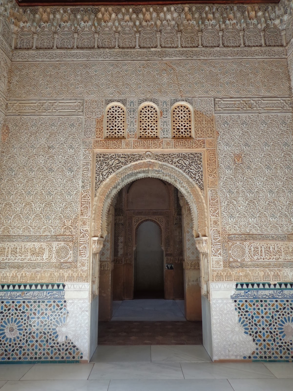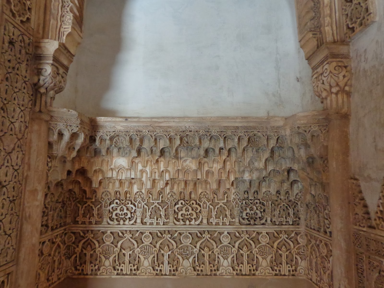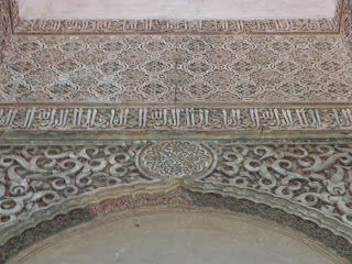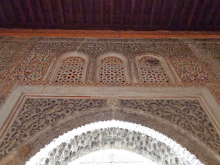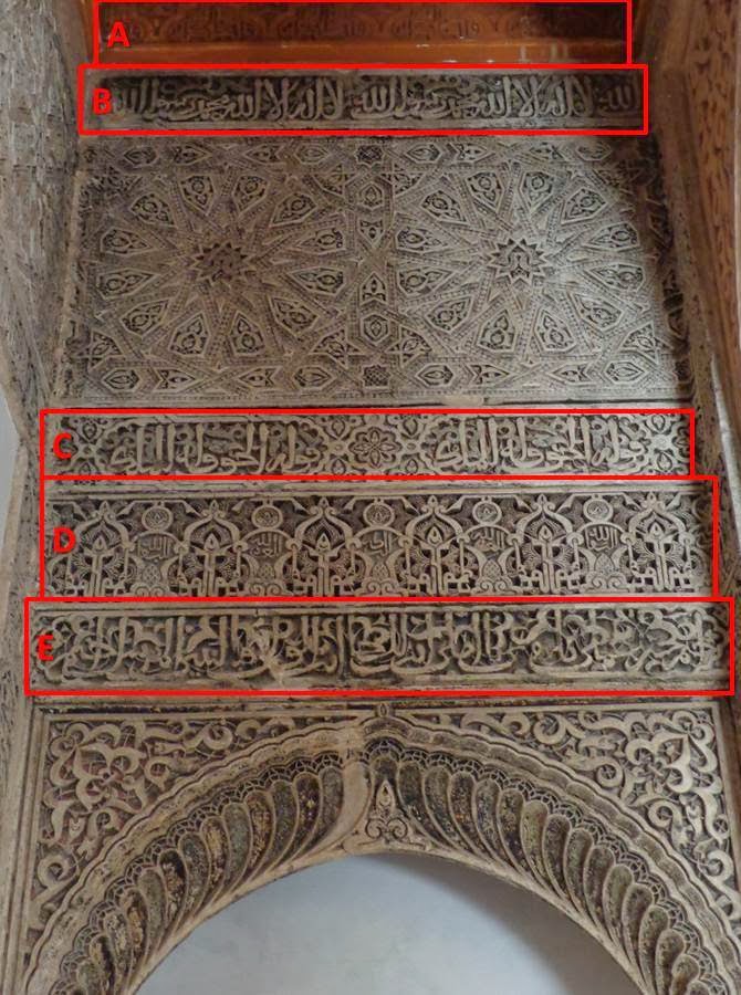 Sobre los zócalos, se combinan adornos de yesería con unos epígrafes que recogen poemas creados por Ibn al-Yayyab para Yusuf I: