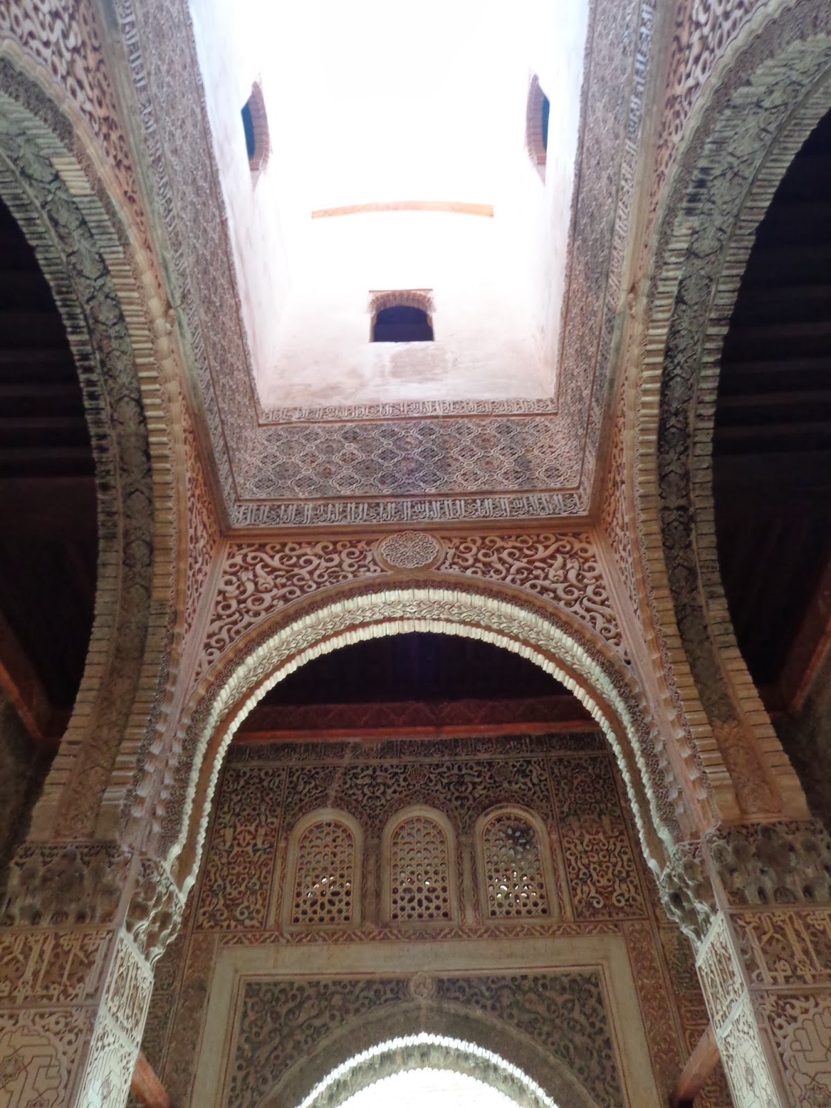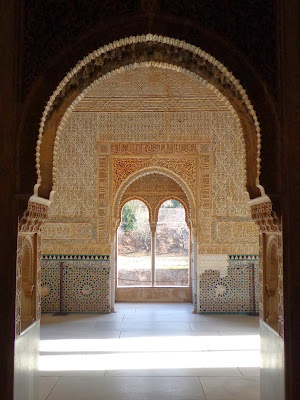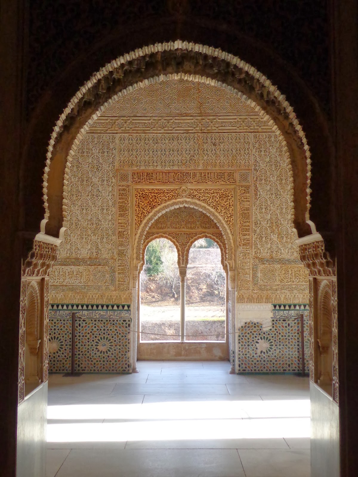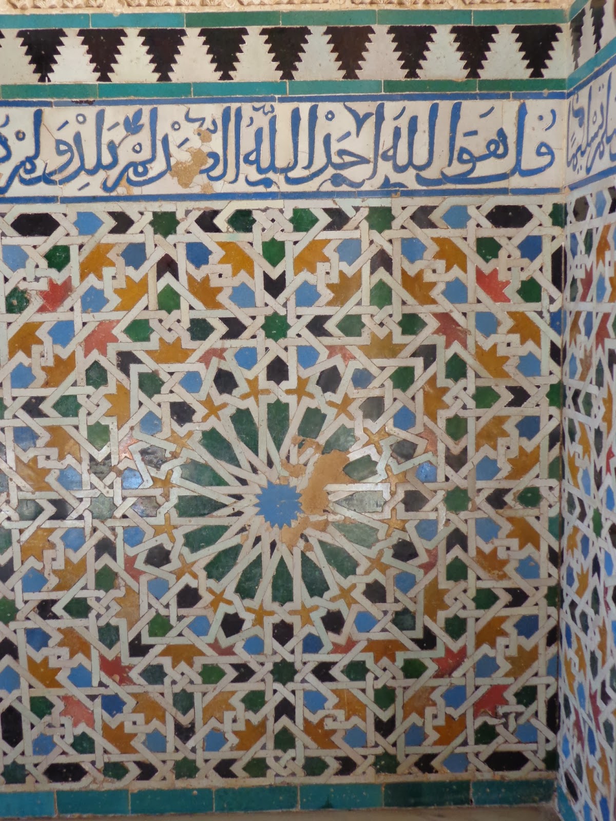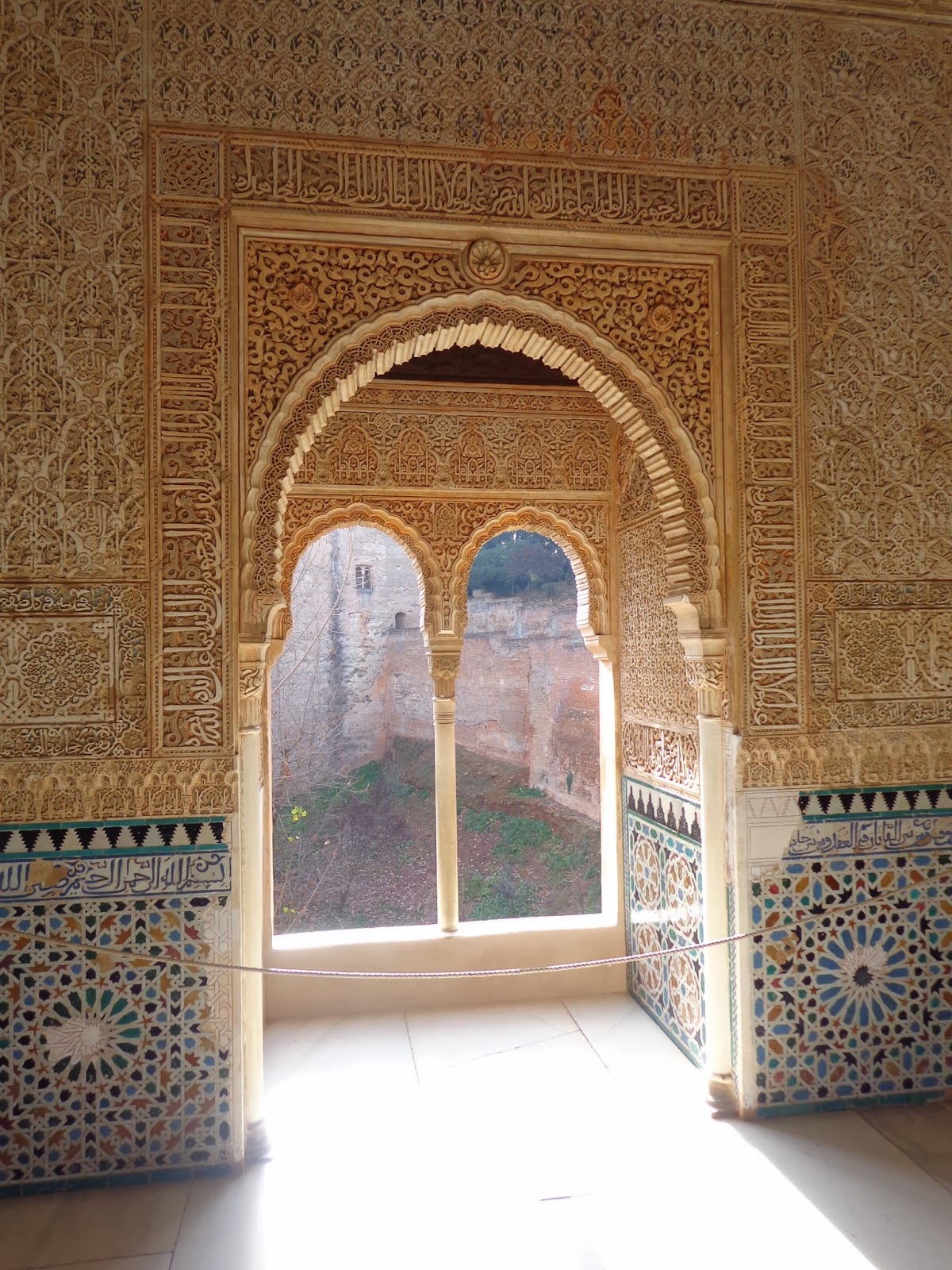 Sobre los zócalos, se combinan adornos de yesería con unos epígrafes que recogen poemas creados por Ibn al-Yayyab para Yusuf I: