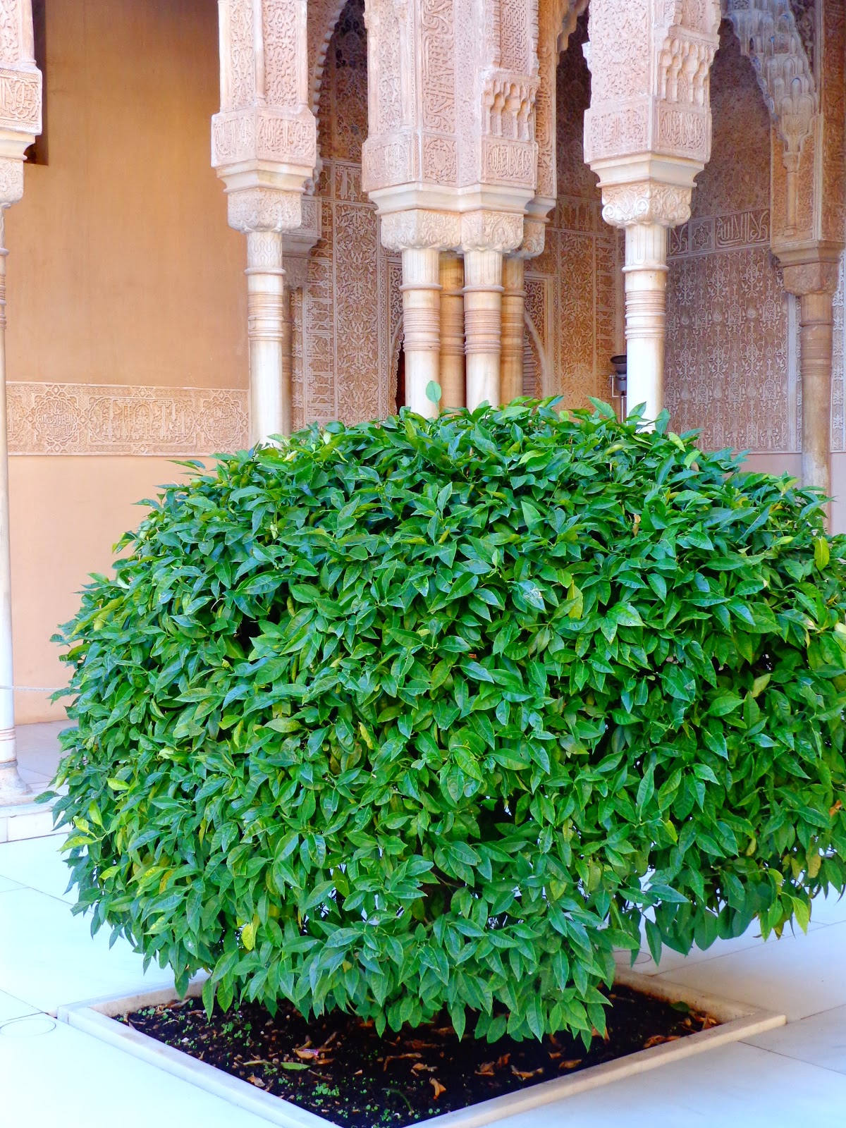 Sea como fuere, el espíritu de jardín puede apreciarse con intensidad en el planteamiento del Patio de los Leones y sus salas inmediatas, lugares destinados a la vida íntima de los soberanos de la Alhambra. El cielo y la luminosidad, con el mismo criterio del patio privado de la vivienda nazarí, constituye aquí un elemento de singular importancia, con la luz atravesando los calados de las yeserías de los paramentos decorados de sebka. Las columnas soportan unas pilastras sobre las que se apoya una estructura adintelada. Los espacios entre pilastra y pilastra están ocupados por superficies de sebka caladas o "de cortina" que no tienen otra función que la de decorar, que nos recuerdan a la vegetación de la copa de los árboles, en este caso en yeso y mármol.