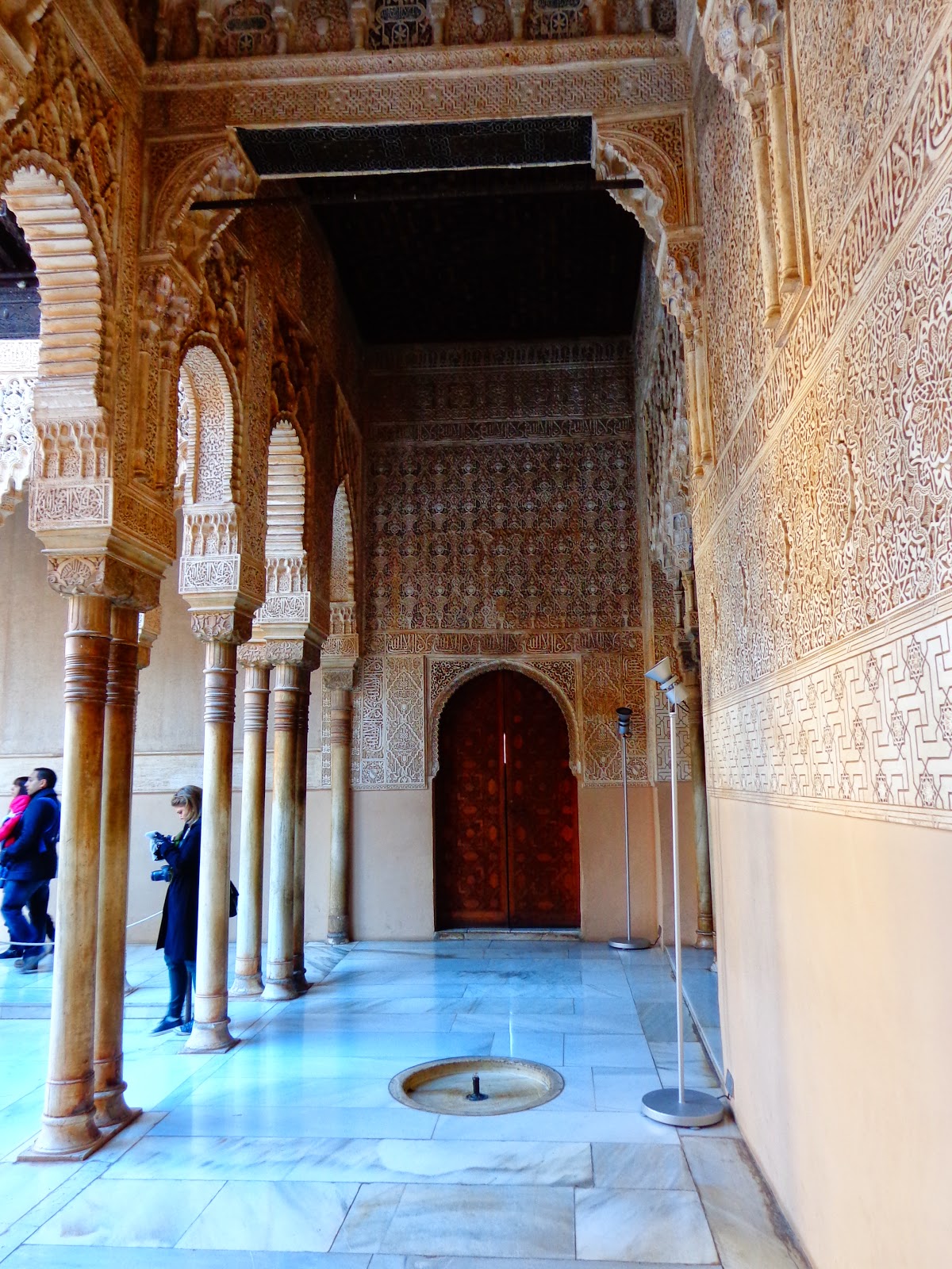 El pensamiento artístico musulmán concibe sus espacios para ser contemplados desde una perspectiva diagonal, con una visión combinada de elementos diagonales y verticales, como pórticos, fuentes, columnas, etc para lograr un despliegue gradual de la belleza del espacio. El acceso original al Palacio de los Leones se efectuaba por el ángulo suroccidental del pórtico, invitando a nuestro ojo a recorrer y descubrir la composición del patio en todo su esplendor.