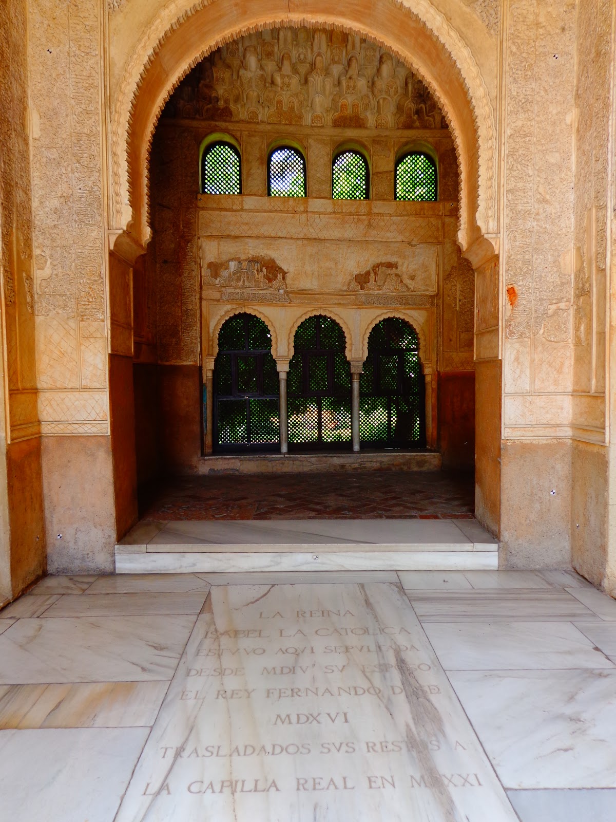 | Esta lápida, en el Palacio de los Infantes, actual Parador de La Alhambra y antiguo convento de San Francisco, recuerda el lugar donde fue enterrada la reina Isabel I |