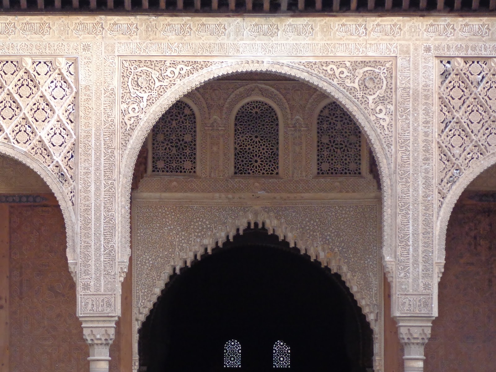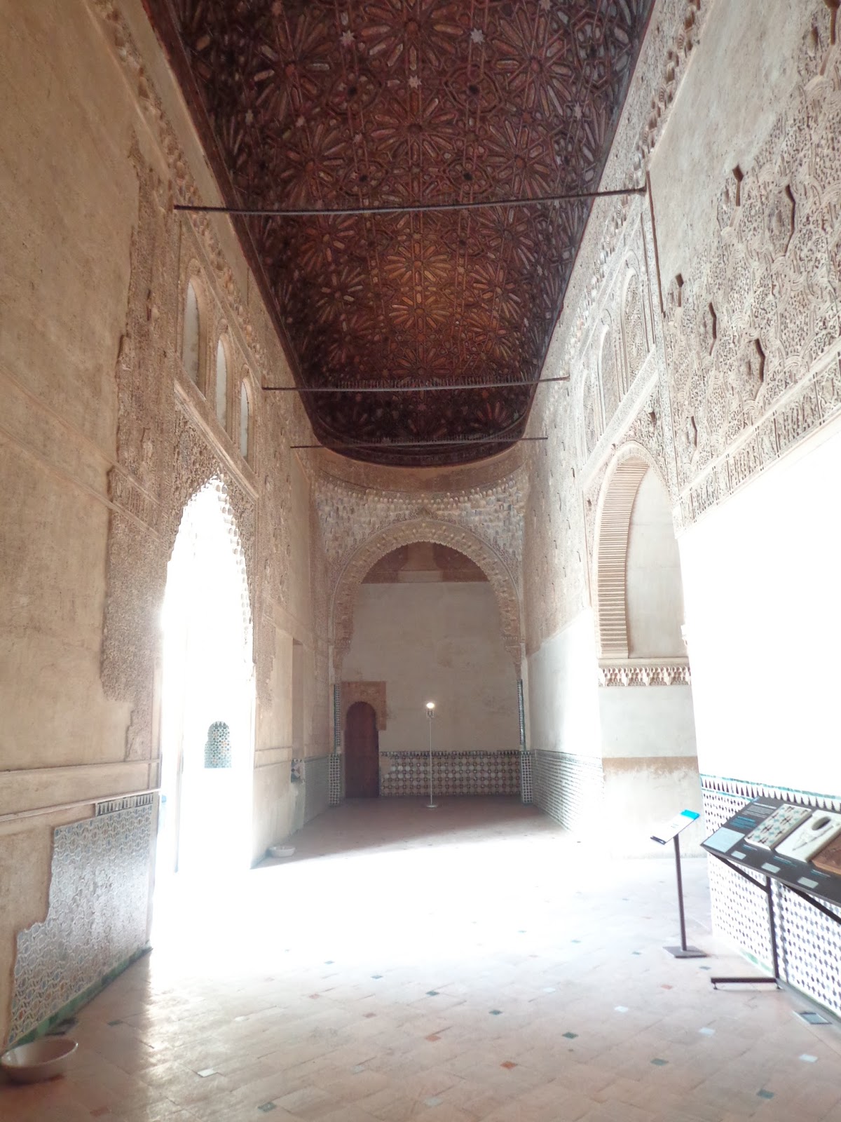 | En el Salón de Embajadores comprobamos como la intensidad luminosa ha ido disminuyendo progresivamente desde el patio a pleno sol, a la penumbra a través del pórtico y sala de la Barca |