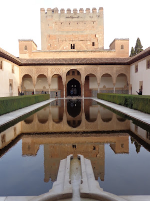 La austeridad de las lineal del conjunto del Palacio de Comares y el equilibrio de sus proporciones impregnan al patio de tan serena majestuosidad que aún se respira en él la noble grandeza de los reyes que lo mandaron construir. Un enorme espejo de agua se encontraba el visitante al franquear la entrada por la puerta principal, en el que se reflejaba la mole blanca de la Torre de Comares. Como la inclinación de los suelos de mármol blanco permitía que el agua de la alberca llegara hasta el arranque de las basas, las columnas del lado norte parecían apoyadas sobre el agua; toda la construcción de ese lado se convertía en un palacio flotante.