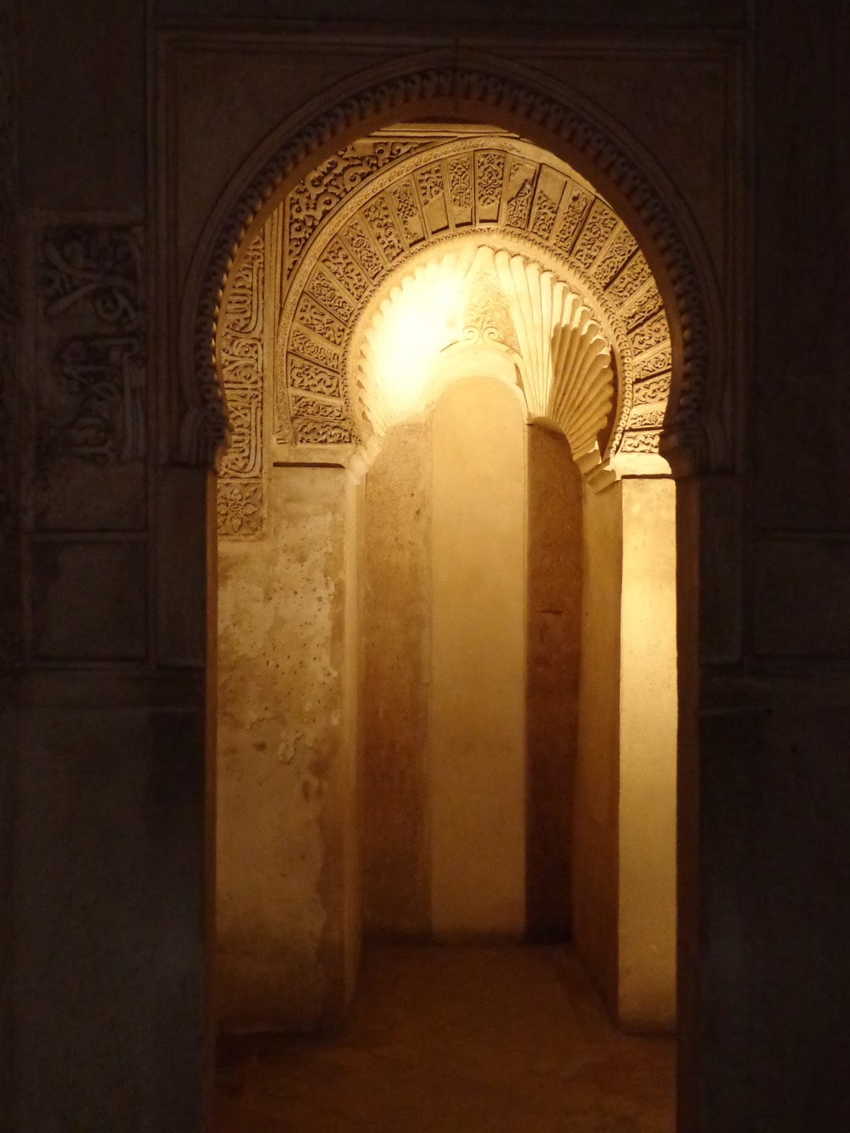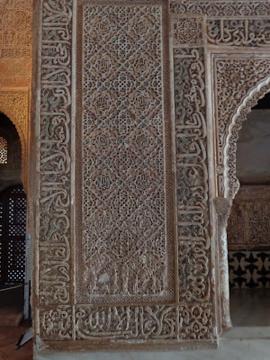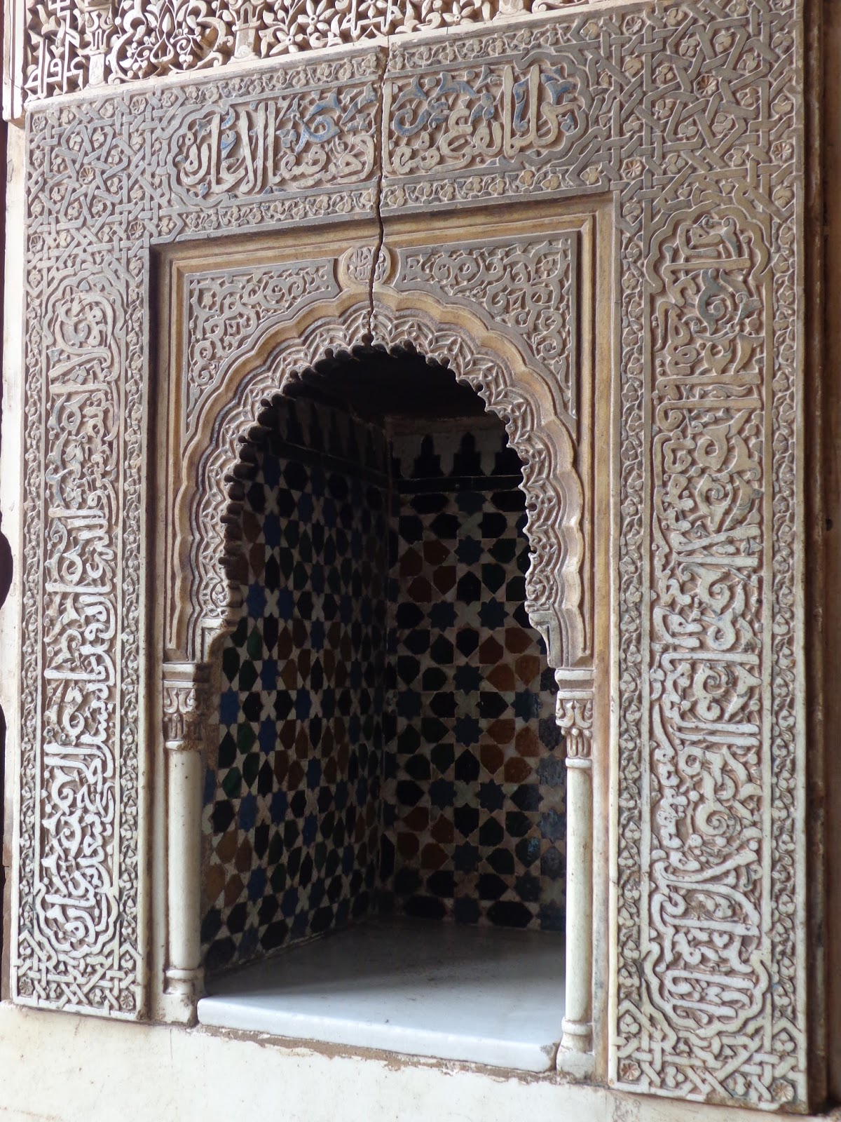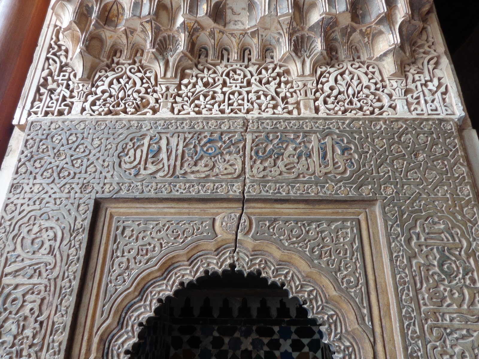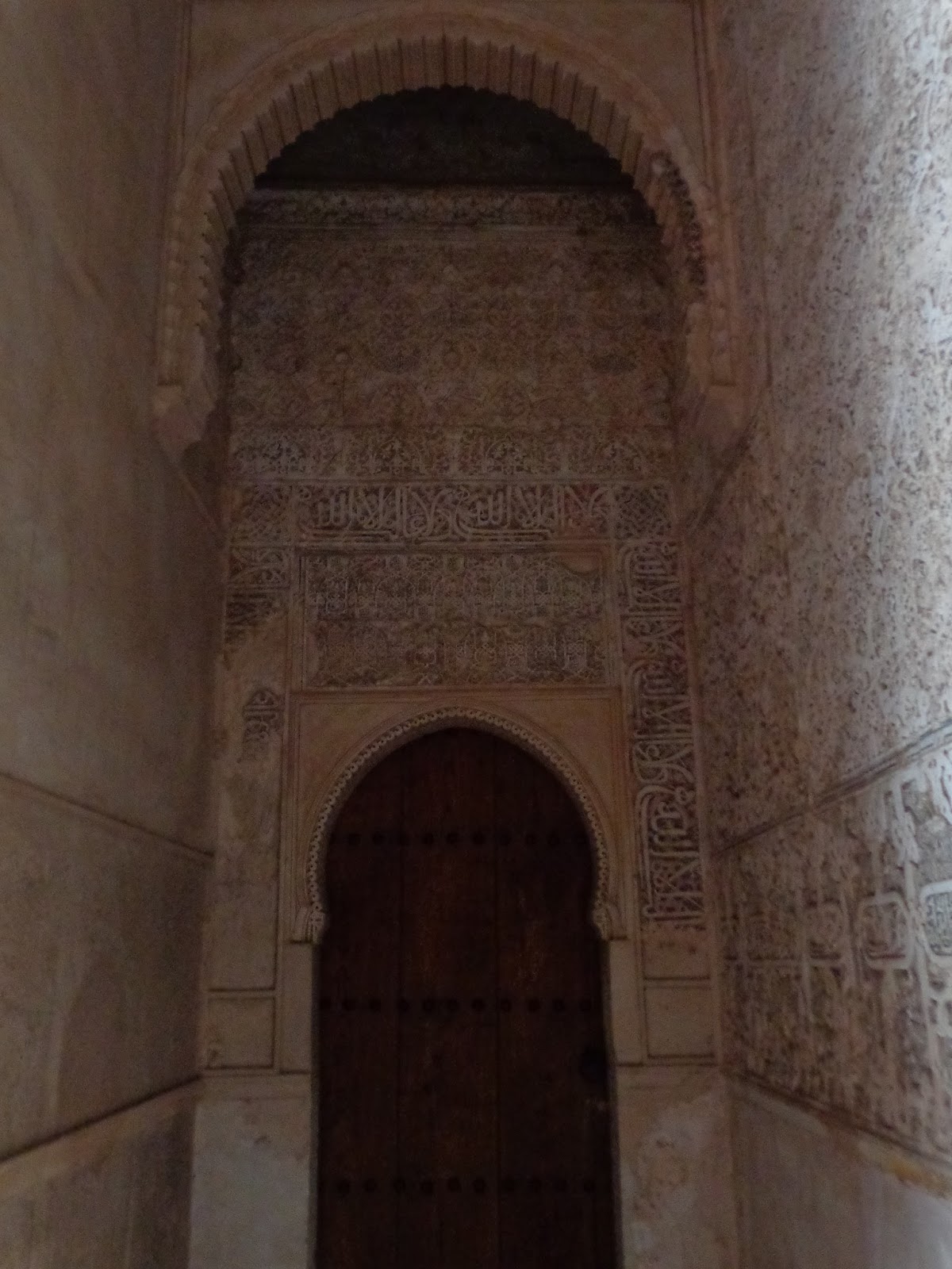 La cámara central, la del trono, frente a la puerta de entrada esta ornamentada con mayor riqueza y en el alfiz de su arco corre una inscripción coránica, en parte destruida y restaurada que el Padre Echevarría tradujo así: