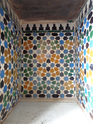 La sala está rodeada por un zócalo de sencillos alicatados diferentes en ambos frentes, y en sus extremos se abren alcobas con zócalos de azulejos que revisten también medias columnas decagonales, sosteniendo festoneados de mocárabes y pechinas en el lugar de las albanegas para apoyar la curva de la bóveda, rematada por columnillas como puede verse en la imagen inferior.
