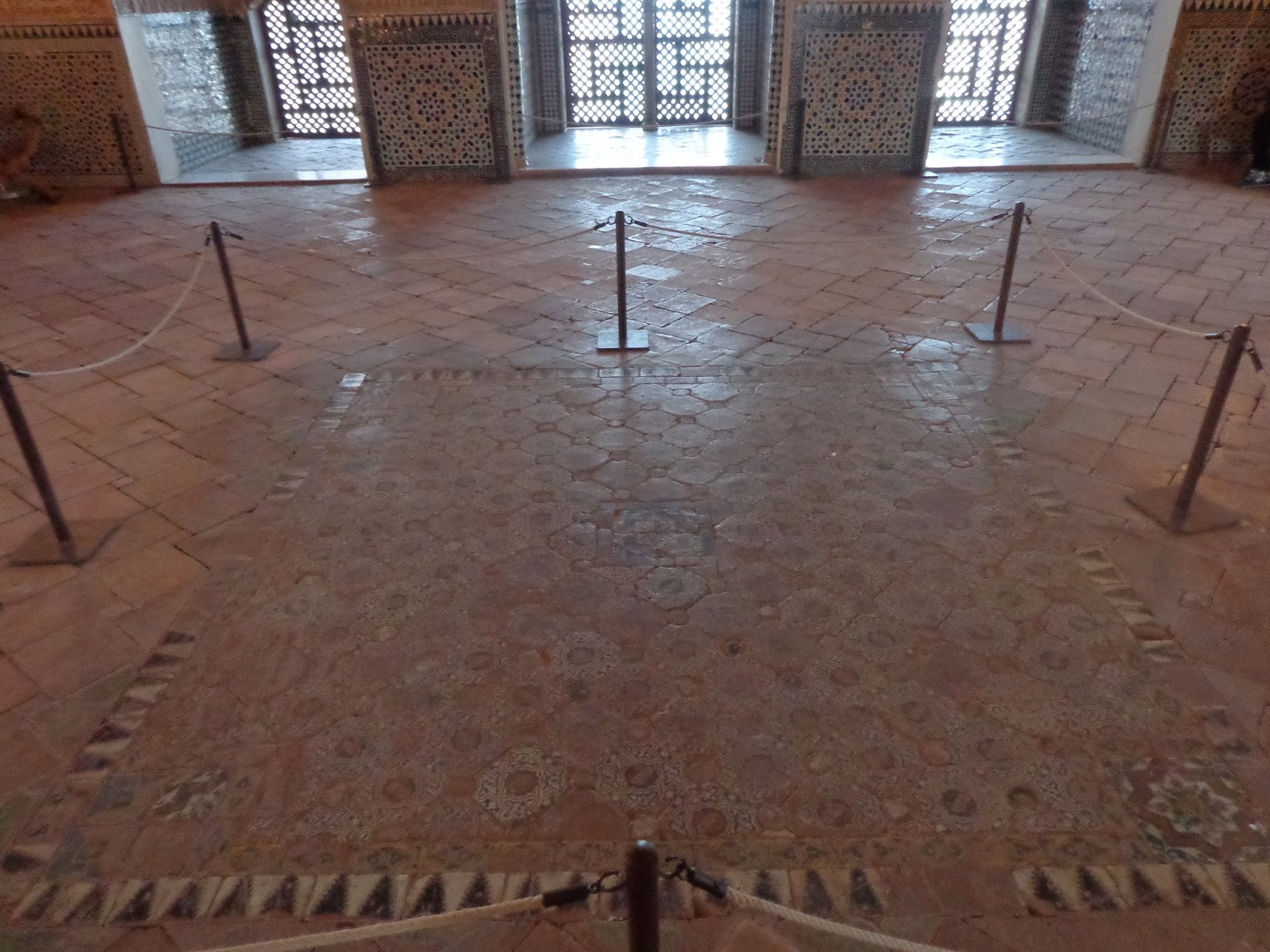 El suelo parece ser que estuvo pavimentado en mármol, pero hoy lo está con losetas de barro, alternadas con olambrillas de fines del siglo XVI, ocupando el centro un tapete de azulejos de igual época con el escudo nazarí.